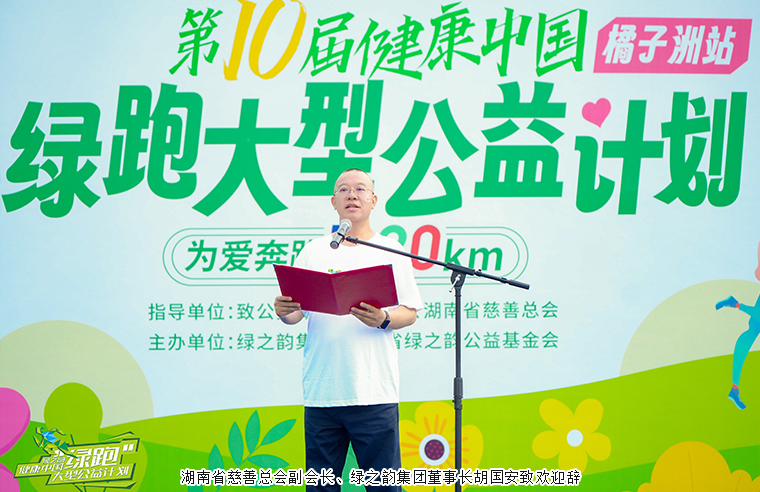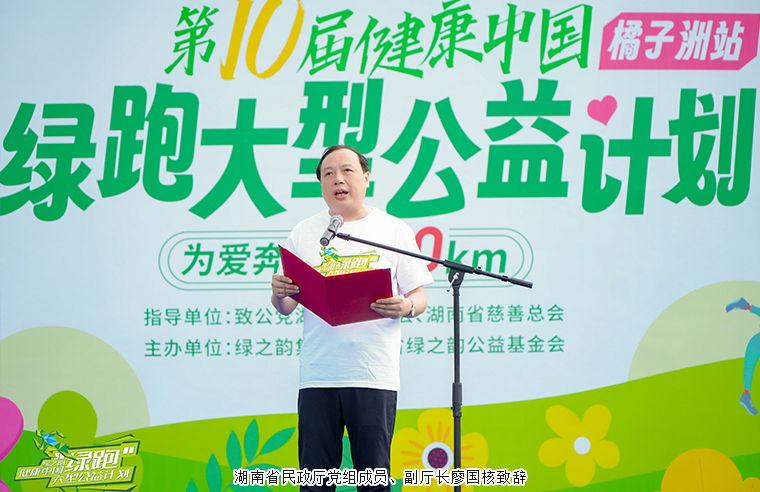 湖南省民政廳黨組成員、副廳長廖國核致辭。他表示,今天,我們相聚在橘子洲,參與第10屆綠之韻“健康中國-綠跑大型公益活動,共同見證湖南省綠之韻公益基金會成立10周年。他代表湖南省民政廳、湖南省慈善總會,向每一位心懷赤誠的參賽選手致以問候,向深耕公益的綠之韻集團表示誠摯感謝,向所有為湖湘慈善事業(yè)添磚加瓦的仁人志士致以崇高的敬意。公益是精神圖騰,慈善是心靈長跑。他表示,10年來,綠跑從松雅湖到湘江,從企業(yè)善意到30萬群眾參與,每一步都刷新公益溫度,丈量文明高度。綠之韻集團22年堅持將公益融入企業(yè)血脈,在扶危濟困等領域播撒希望。綠跑活動10年捐贈款物近3000萬元,吸引3萬人參與,輻射超30萬人次。湖南省綠之韻公益基金會10年來組織了400多場公益活動,捐贈款物9100多萬,彰顯了企業(yè)擔當,詮釋了湖湘精神。